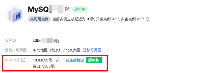 <内网 ip 地址>:替换为目标 MySQL 数据库实例的内网地址,在 MySQL 控制台 的实例详情页可查看内网地址。 <用户名,默认 root>:替换为目标 MySQL 数据库实例的账号名,默认的账号名是 root。