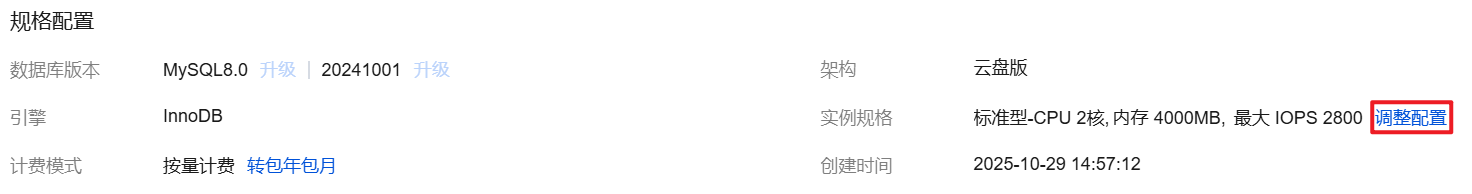 1. 登录 MySQL 控制台,在实例列表,单击实例 ID 或操作列的管理,进入实例详情页。 2. 在实例详情 > 规格配置 > 实例规格后,选择调整配置。