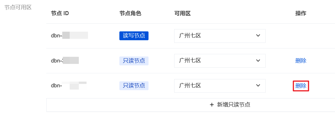 3. 在调整配置页面,节点可用区下面,找到需要删除的只读节点,单击删除。