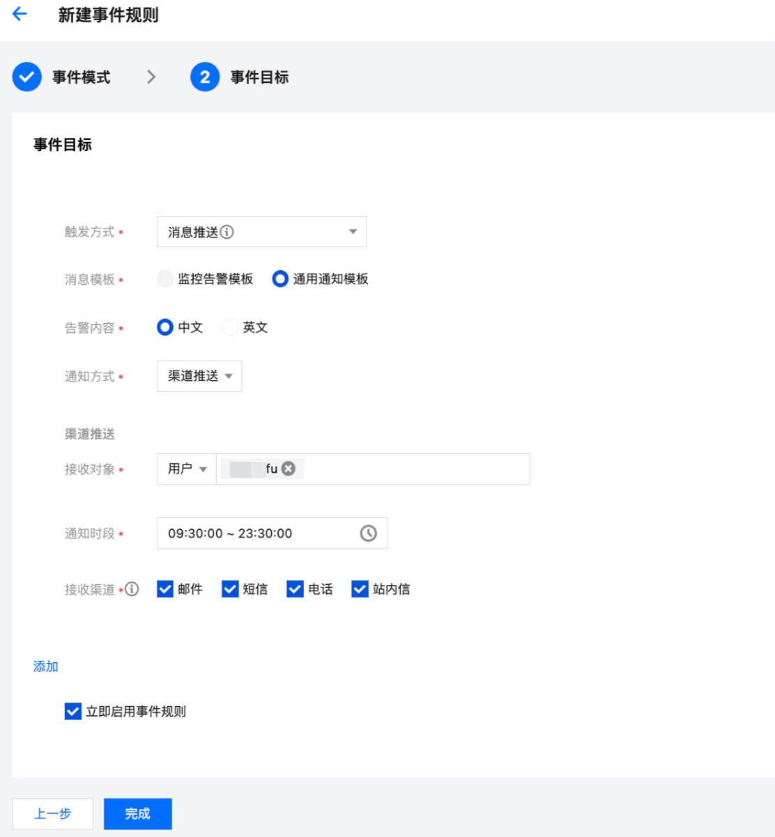 6. 在事件目标页完成相关配置,勾选立即启用事件规则,单击完成。(触发方式有多种类型,您可按需选择,下图以触发方式选择“消息推送”为例,渠道推送将会推送给设定的联系人,需要在接收对象处单独设定接收用户,通知时段请对应账号用户协商确认,接收渠道可选择邮件、站内信、短信、电话)