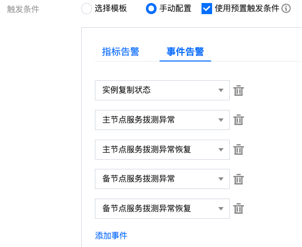 触发条件:找到事件告警,单击添加事件,根据业务需要添加告警事件。