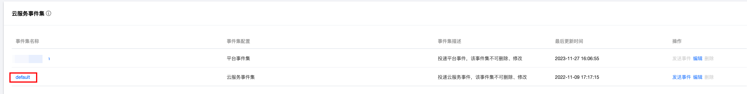 3. 点击云服务事件集下的 default 事件集。