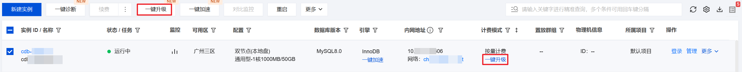 2. 在实例列表找到需要升级的实例,在其计费模式列单击一键升级,或勾选目标实例后单击实例列表上方的一键升级。