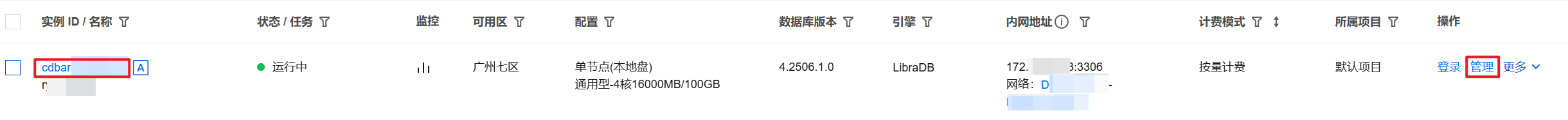 1. 登录 MySQL 控制台,在实例列表中,单击实例 ID 或操作列的管理,进入实例详情页面。 2. 在实例架构图下找到只读分析引擎实例,单击实例 ID 进入只读分析引擎详情页面。