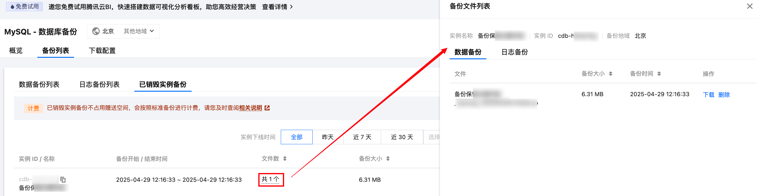 实例销毁后备份文件选择为“保留”的实例,在被销毁下线后,已销毁实例的备份可以通过数据库备份页面进行查询和下载。