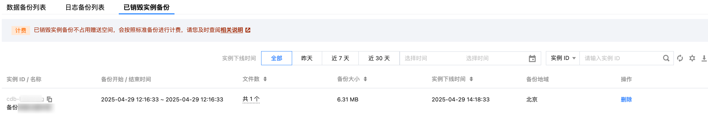 过滤实例 ID:支持通过实例 ID,精准过滤出需要查询的实例的已销毁备份。