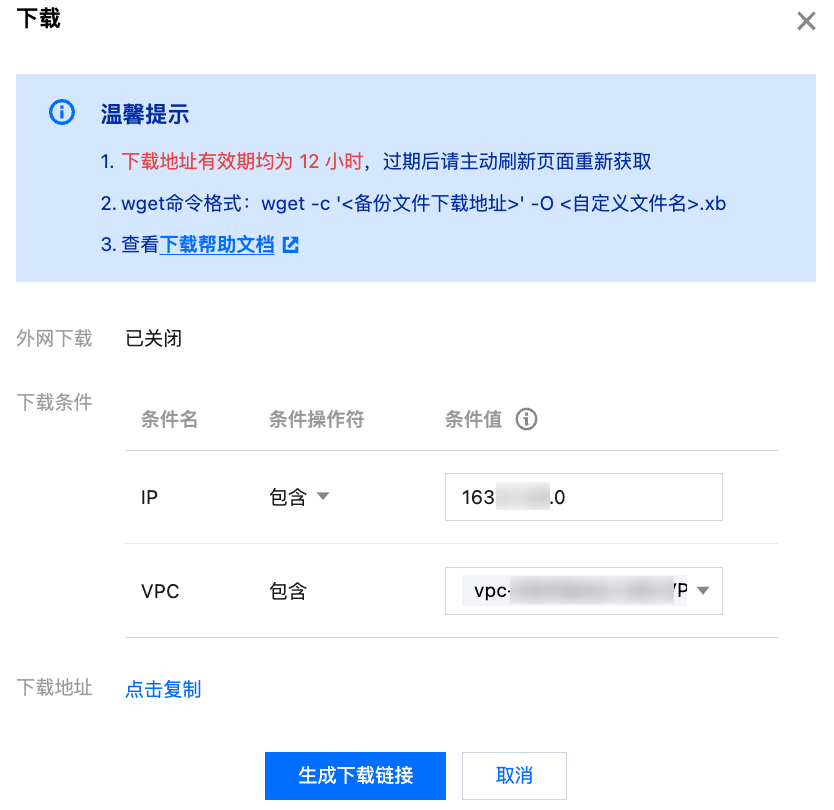 若下载设置中开启了外网下载,则此时无需设置下载条件,您可复制下载链接通过 wget 命令进行下载,或者直接进行本地下载。如何设置备份下载规则,请参见 设置备份下载规则。