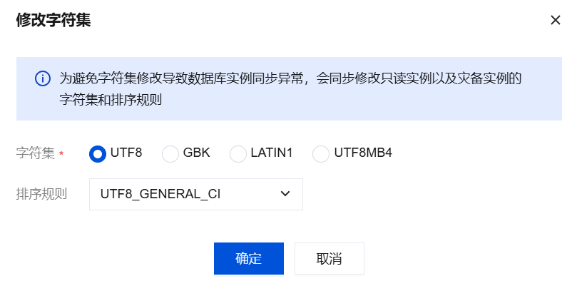 1. 通过 SQL 语言执行如下语句可修改云数据库实例的默认字符集编码: