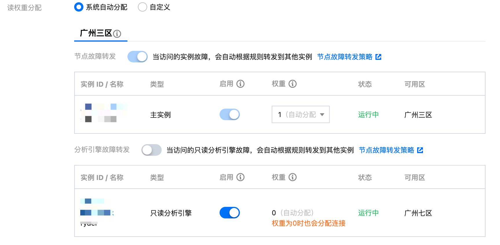 以上实例故障转发策略暂时不支持修改。只读实例与读写实例故障转发参数默认为打开状态,只读分析引擎故障转发参数默认为关闭状态。