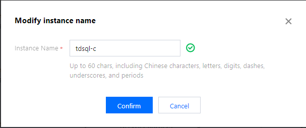 1. 登录 MariaDB 控制台 ,在实例列表,单击实例名的 图标。或单击实例名进入实例详情页,单击实例名后的 图标。 2. 在弹出的对话框,修改实例名称,单击确定。