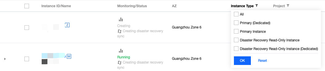 灾备/只读实例可在其所在地域查看,可在实例列表筛选出该地域全部灾备/只读实例。