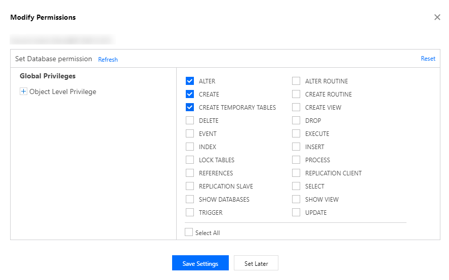 5. 在弹出的对话框,设置数据库权限,单击保存设置,也可以选择之后设置。