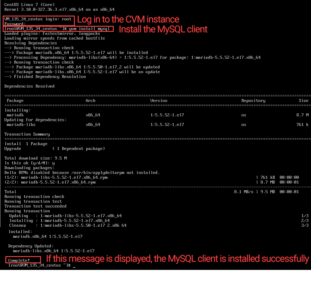 6. 以 CentOS 7.2 64位系统的 CVM 为例,利用 CentOS 自带的包管理软件 Yum 去腾讯云的镜像源下载安装 MySQL 客户端。