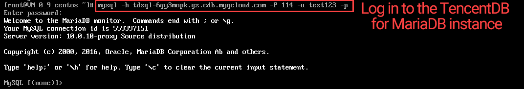 请将 hostname 替换为目标 MariaDB 数据库实例的内网 IP 地址,username 替换为之前创建的用户名,并在提示Enter password:后输入用户名对应的密码。