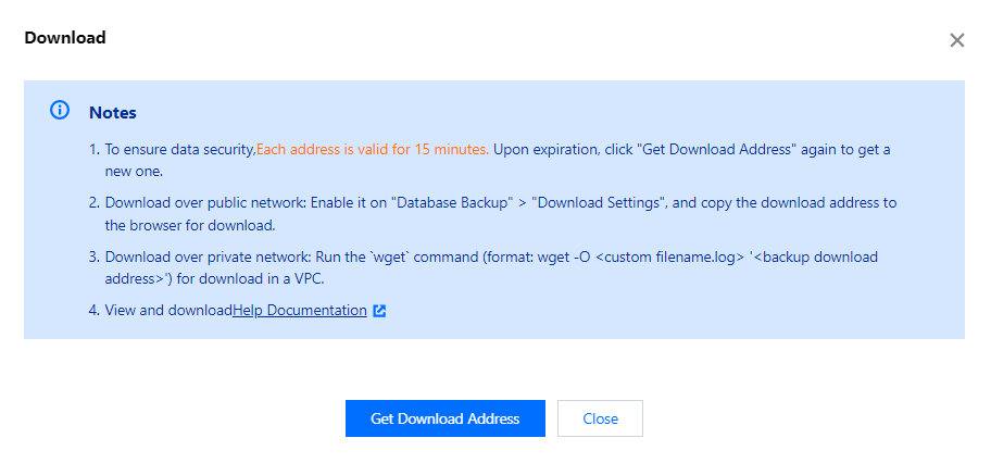 内网下载:请在 VPC 网络中进行访问,使用 wget 命令下载:wget -O <自定义名称.log> '<备份文件下载地址>'。