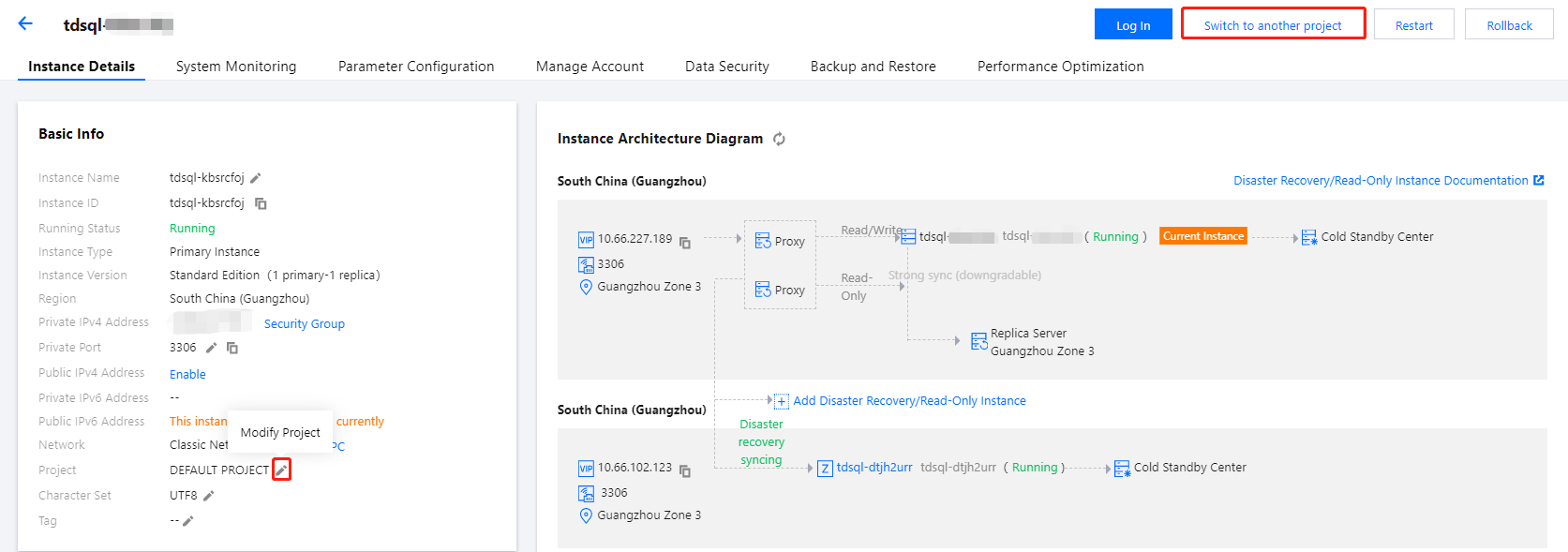 只读实例、灾备实例属于主实例的关联实例,需要与主实例处于同一项目中。