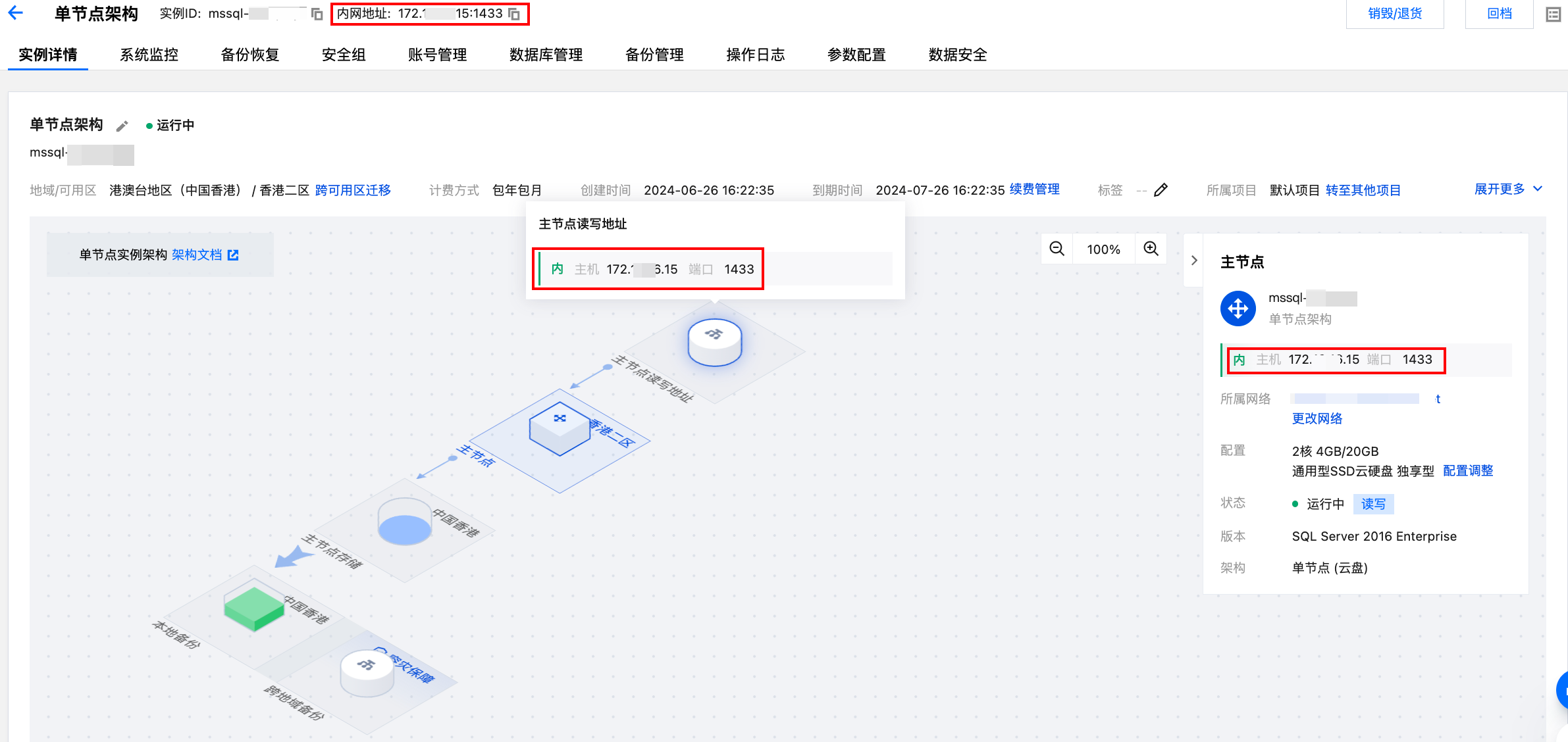 2. 根据实际连接需要,在实例管理页顶部、实例详情页右侧的实例信息内或者拓扑图内,可查询到实例的内网 IP 和端口号,具体情形如下。