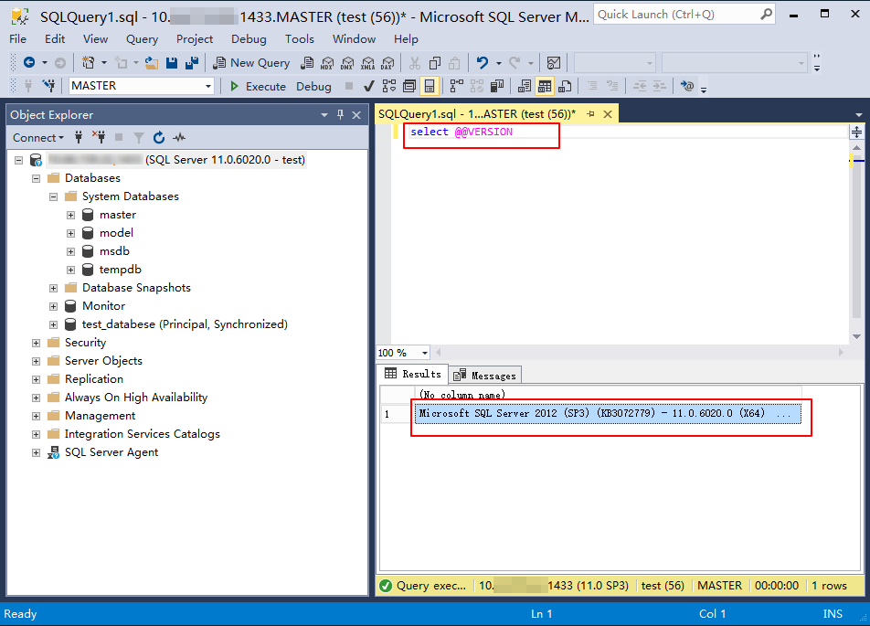 运行查询,SQL Server Management Studio 会返回 SQL Server 版的腾讯云云数据库实例。