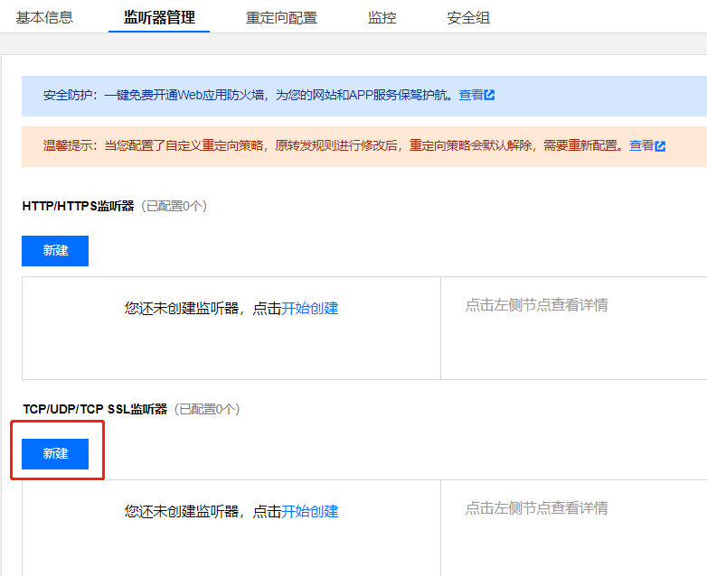 b. 在实例管理页面,选择监听器管理页,在 TCP/UDP/TCP SSL监听器下方,单击新建。 c. 在弹出的对话框,逐步完成设置,然后单击提交即可完成创建。