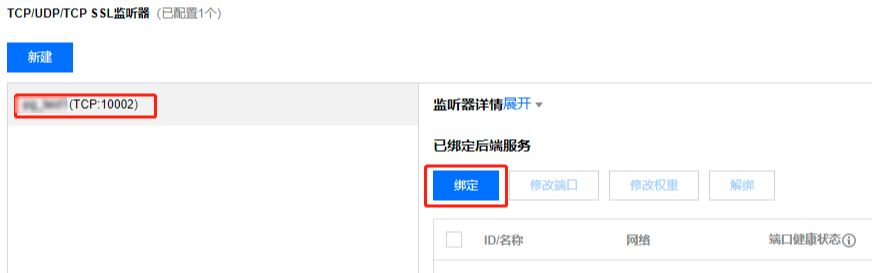 1. 创建好监听器后,在监听器管理页,单击创建好的监听器,然后单击右侧出现的绑定。