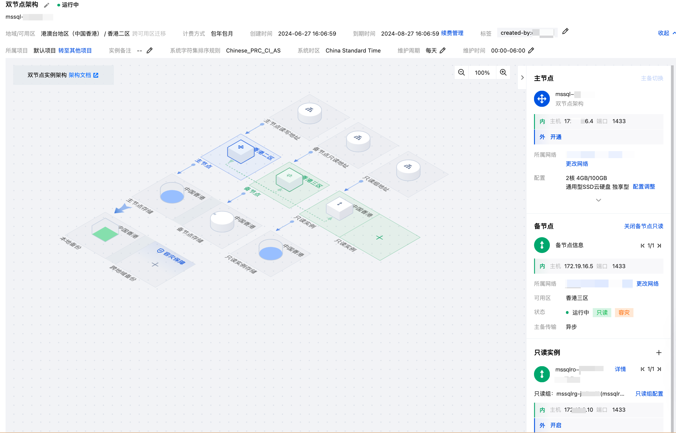 实例详情 | 在实例详情页面,您可以查看和操作数据库的各种信息,包括设置维护信息以及在实例架构图中添加“只读实例”。 |