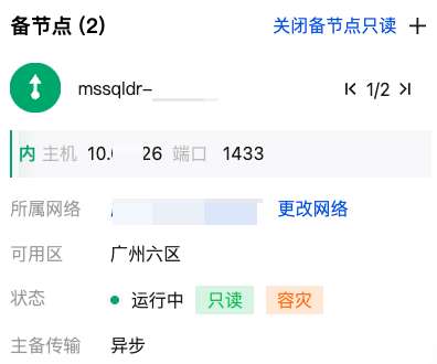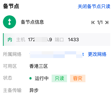 | ![]() | 备节点信息 | 在右侧备节点下,可以开启备节点只读,开启后可以查询备节点只读地址。可以查询备节点的所属网络、可用区、实例状态、主备传输方式信息。 |