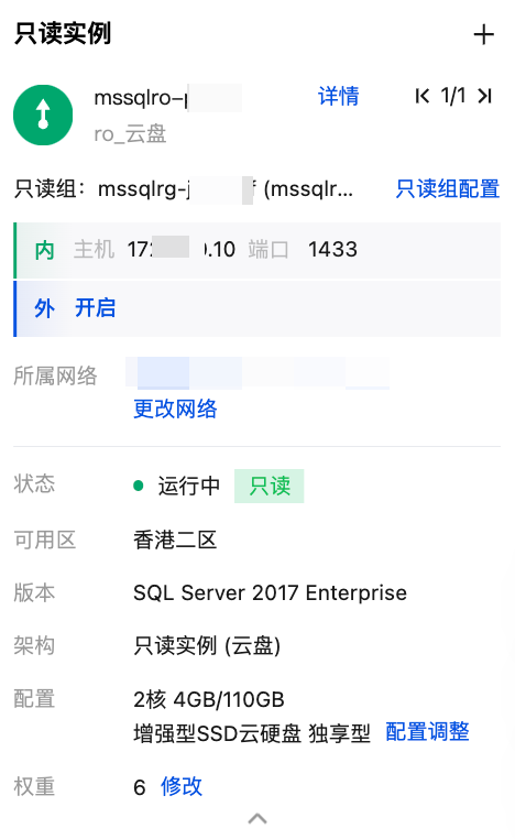 | ![]() | 只读实例信息 | 在右侧只读实例下,可以查询只读实例的内网地址、外网地址、所属网络、实例状态、可用区、版本、架构、配置、权重信息。 |