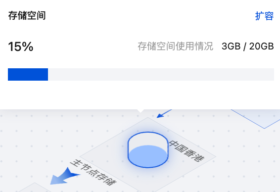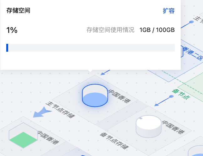 | ![]() | 主节点存储 | 鼠标指向拓扑图中的主节点存储,可查询实例存储空间的使用情况,备节点存储使用情况和主节点一致,单击扩容,可跳转至调整配置页面进行设置。 |