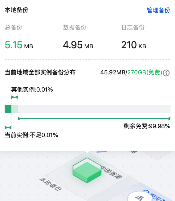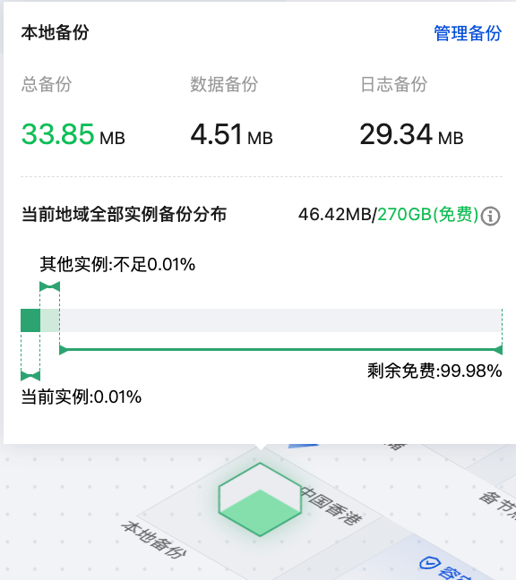 | ![]() | 本地备份 | 鼠标指向拓扑图中的本地备份,可查询本地备份的具体情况,例如总备份、数据备份、日志备份,以及实际占用空间/总免费空间额度等。 |