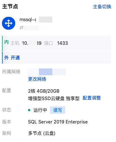 | ![]() | 备节点信息 | 在右侧备节点下,可以开启备节点只读,开启后可以查询备节点只读地址、所属网络、可用区、实例状态、主备传输方式信息。 |