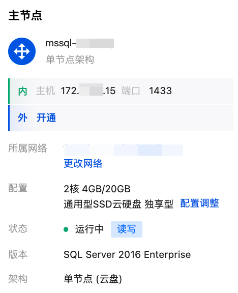 | ![]() | 主节点信息 | 在右侧主节点下,可以查询主节点的内网地址、外网地址、所属网络、配置、实例状态、版本、架构信息。 |