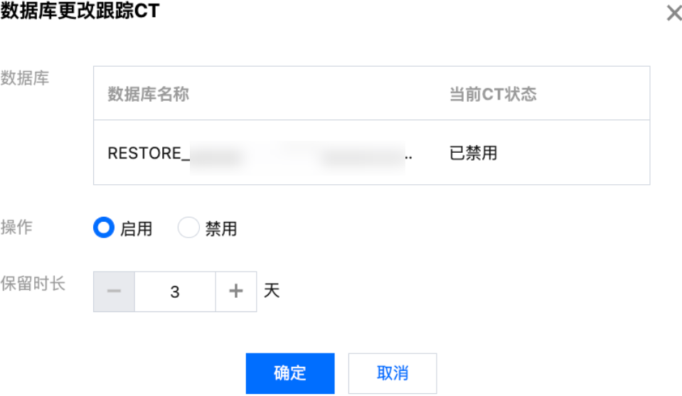 3. 在弹出的对话框,展示了数据库名称及当前 CT 状态,对 CT 进行启用或者禁用后,单击确定,其中启用 CT 支持设置数据保留时长。