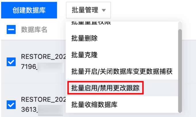 2. 在实例管理页面,选择数据库管理页,勾选目标数据库,在列表上方选择批量管理 > 批量启用/禁用更改跟踪。