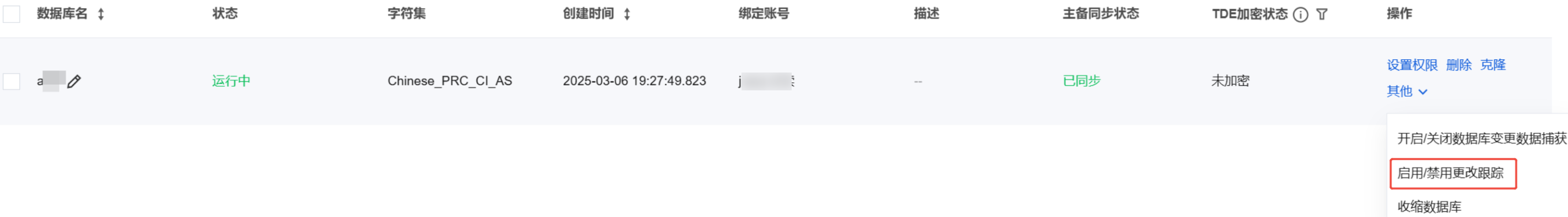 2. 在实例管理页面,选择数据库管理页,选择目标数据库所在行,在操作列选择其它 > 启用/禁用更改跟踪。
