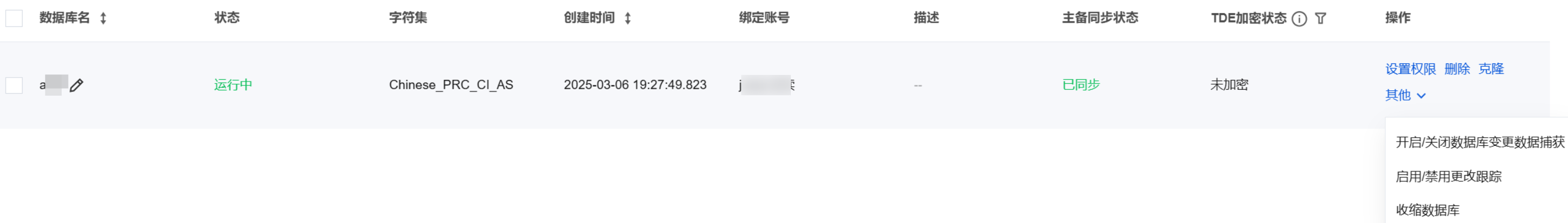 2. 在实例管理页面,选择数据库管理页,选择目标数据库所在行,在操作列选择其它 > 开启/关闭变更数据捕获。
