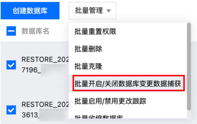 2. 在实例管理页面,选择数据库管理页,勾选目标数据库行,在列表上方选择批量管理 > 批量开启/关闭变更数据捕获。