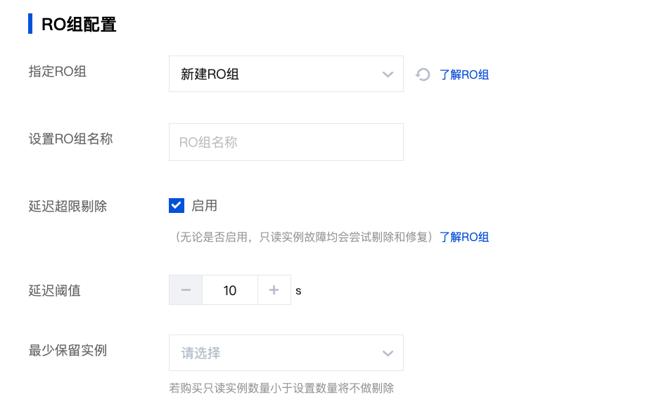 在只读实例 RO 组的配置界面,可以配置只读实例 RO 组的名称、延时超限策略、延时阈值、最少保留实例、读权重等基本信息。