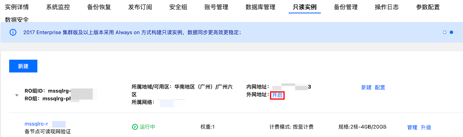 3. 在实例详情页选择只读实例页,然后在 RO 组下的外网地址后单击开启或关闭。