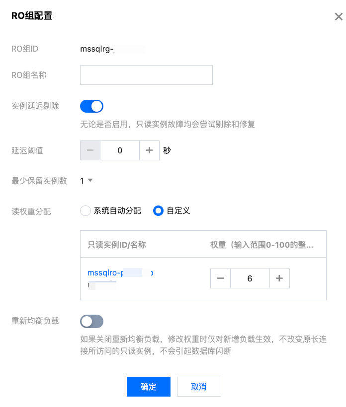 新建 RO 组 | 新建一个 RO 组,若一次购买多个实例,将都分配至这个 RO 组。权重分配方式默认为系统自动分配。 |