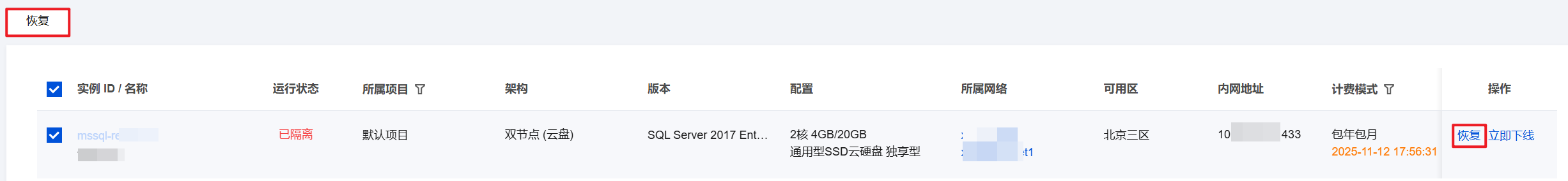 4. 找到需恢复的实例,单击操作列的恢复,或勾选实例后单击上方的恢复。