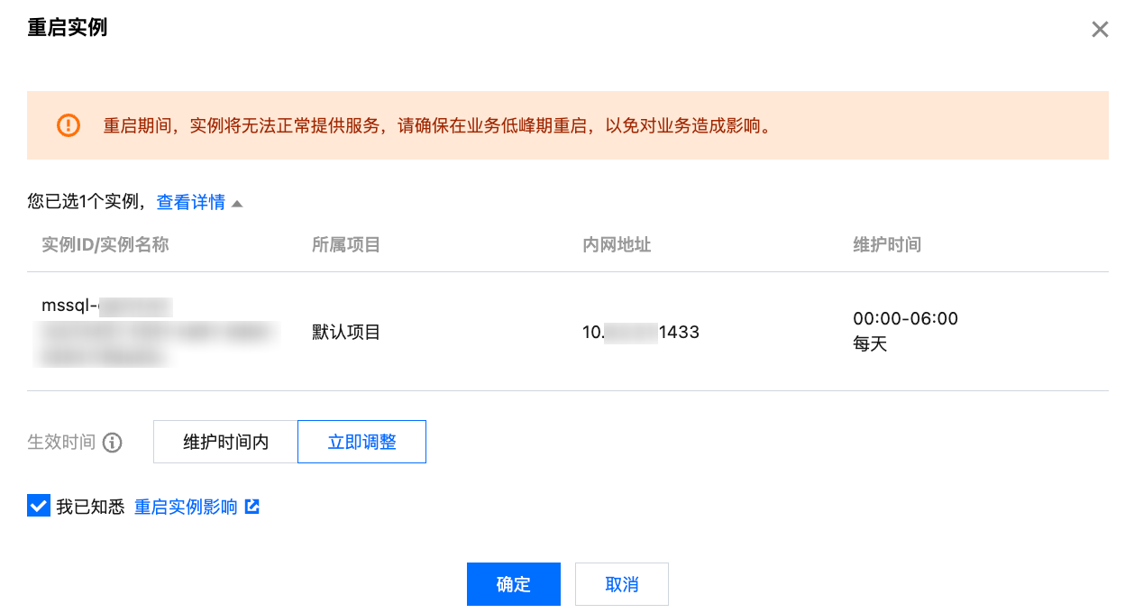 3. 在弹出的对话框,选择生效时间,勾选“我已知悉 重启实例影响”,单击确定。 默认选中立即调整,您可根据需要选择生效时间。