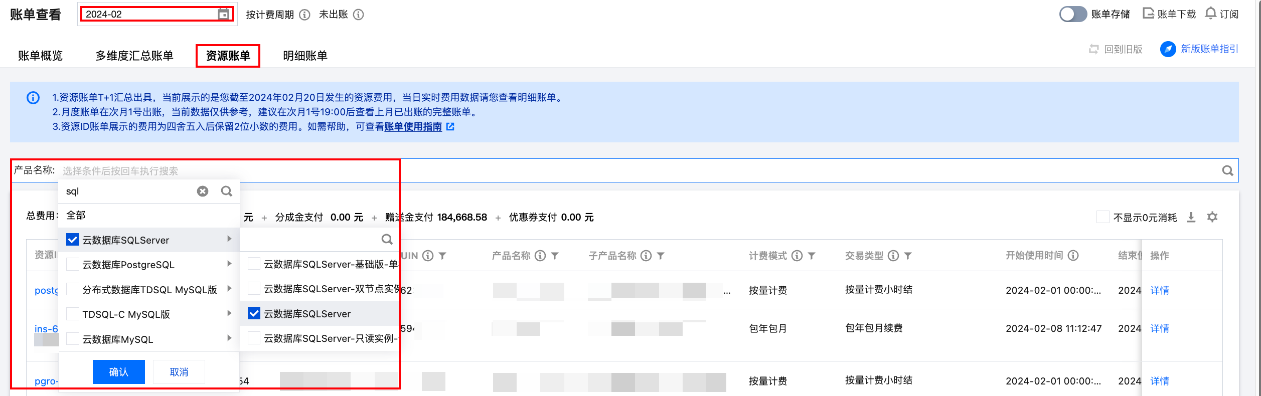 4. 在账单查看页面上方选择查询时间(月度),选择资源账单,然后在搜索框内选择产品名称,筛选找到云数据库 SQL Server,单击确定,即可在列表下查询该产品在所选月度产生的费用账单。