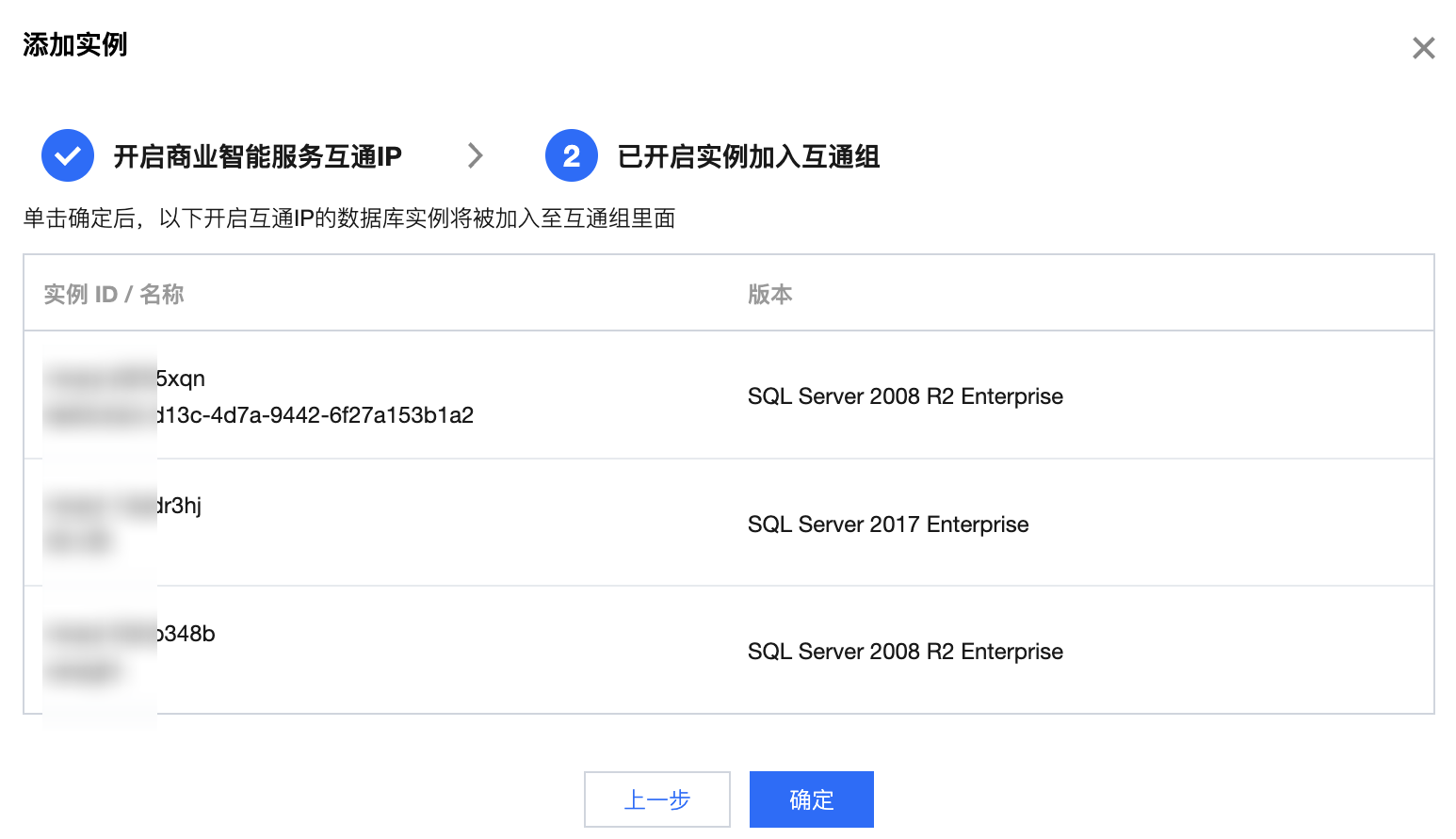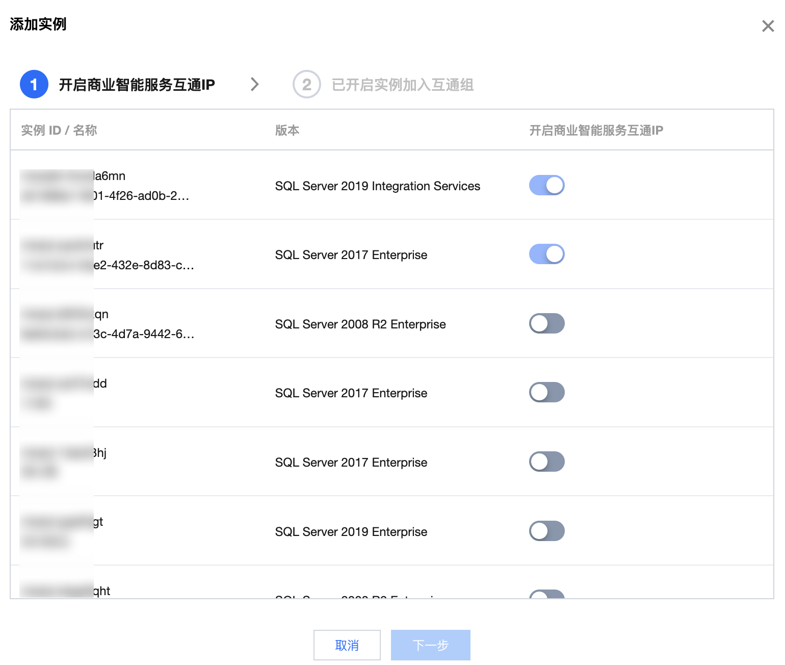3. 在添加实例窗口,选择需要加入到互通组中的数据库实例及商业智能服务器实例,同时加入到互通组中的每个实例均需要开启商业智能服务互通 IP,单击按钮,即可开启(支持多选),单击下一步。
