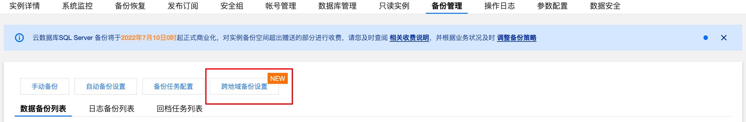 3. 在实例管理页选择备份管理,单击跨地域备份设置。