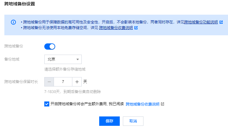 跨地域备份收费说明 | 开启跨地域备份会产生额外费用,阅读后勾选此项 |