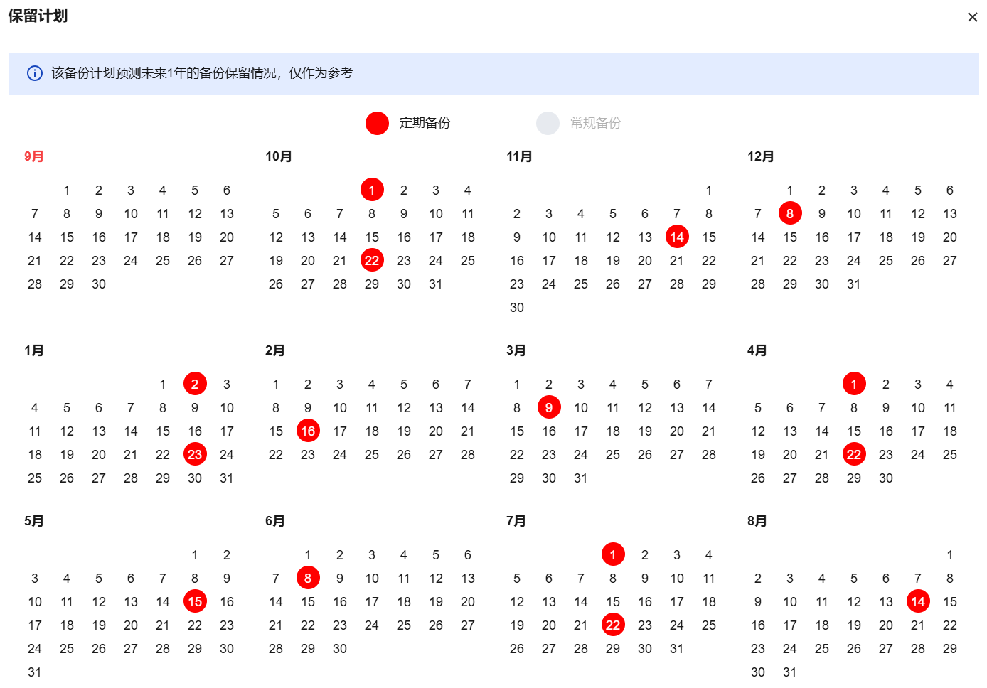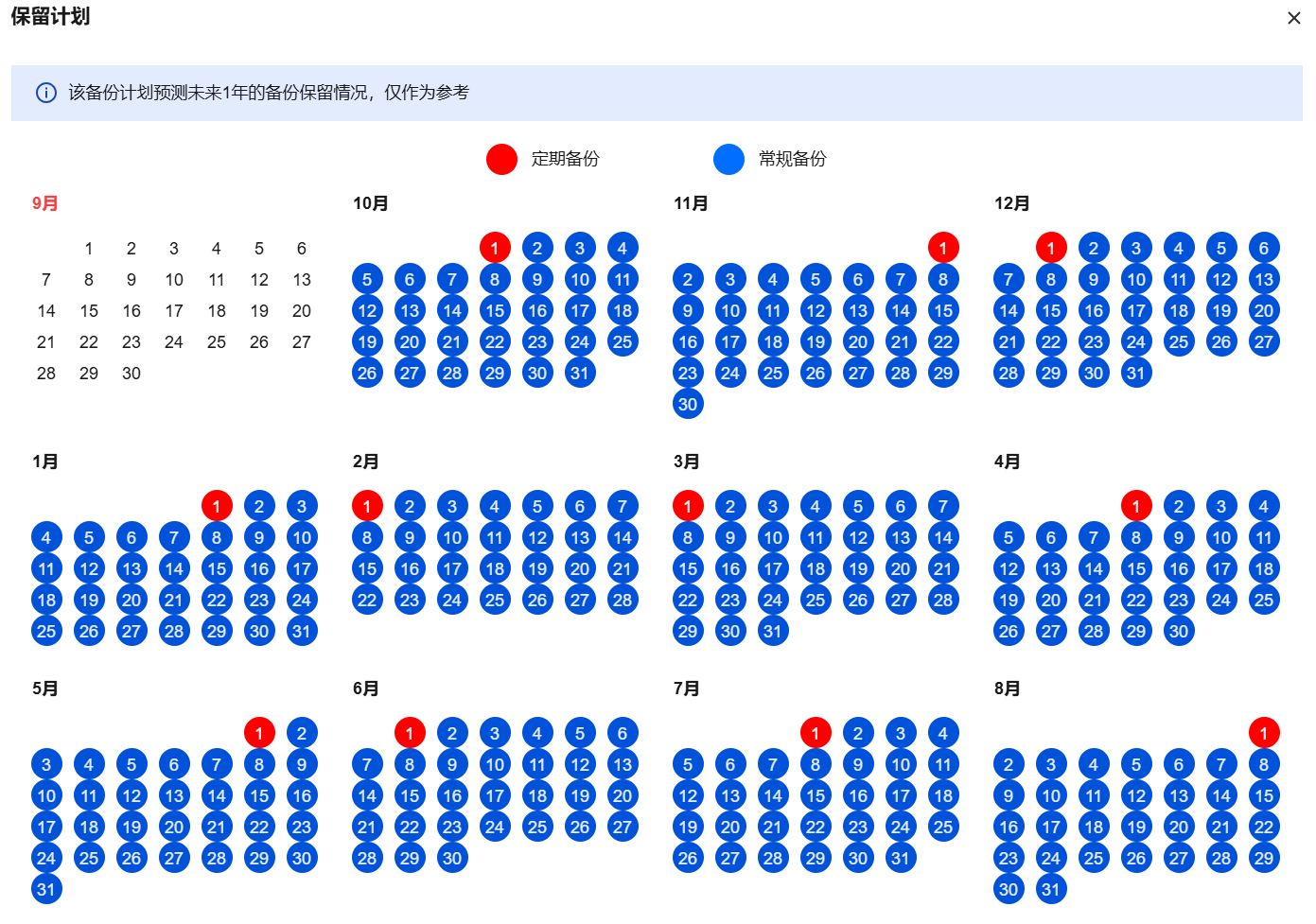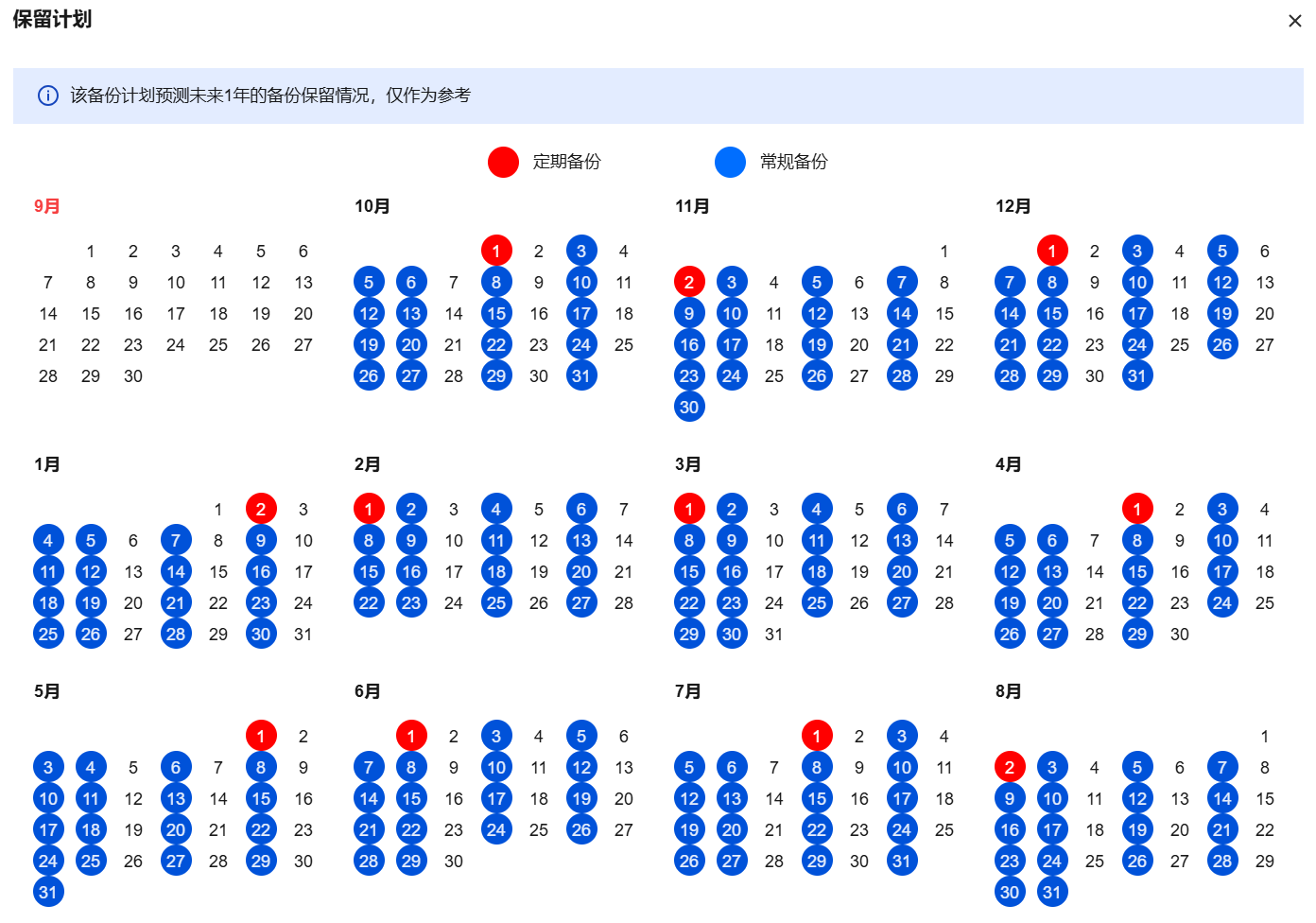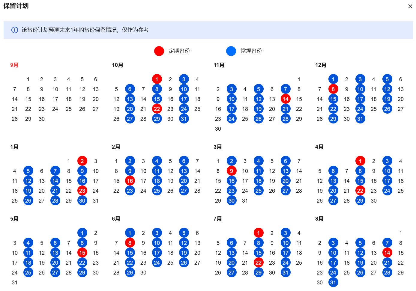 备份计划预览暂时为未来1年的备份保留情况,仅作为参考。