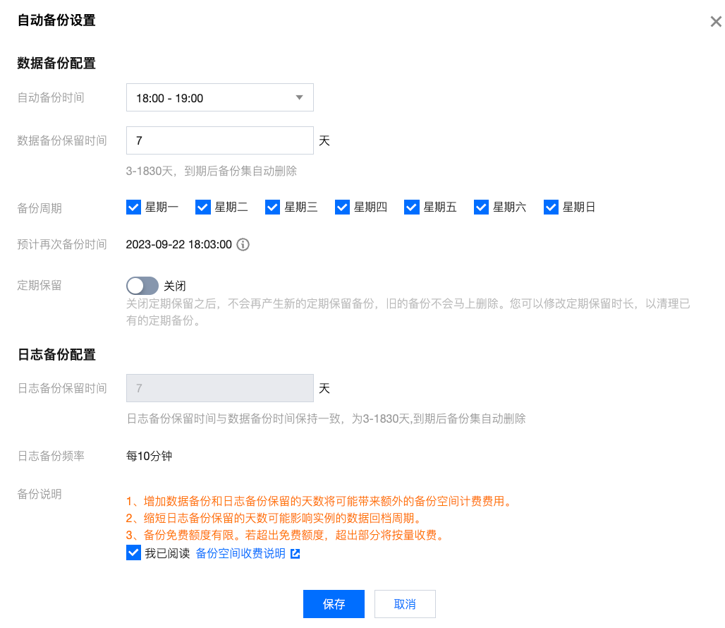 增加数据备份和日志备份保留的天数将可能带来额外的备份空间计费费用。