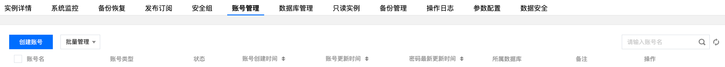 账号名 | 显示实例下已创建的所有账号名称。 |