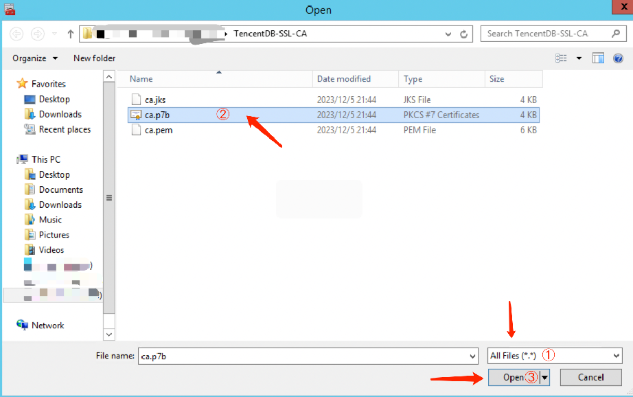 5. 选择下载到本地的 TencentDB-SSL-CA 证书文件,单击打开。