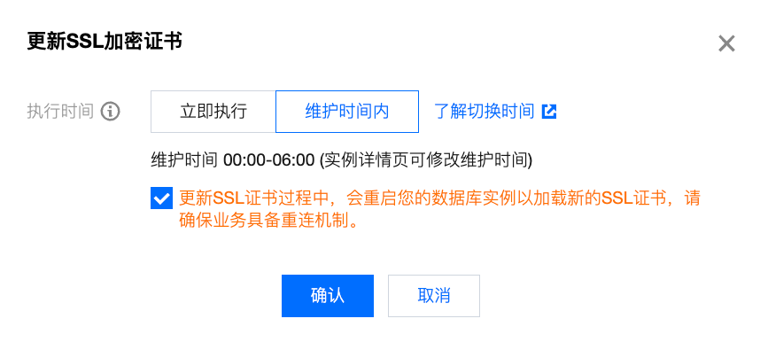 在弹窗下选择执行时间,勾选“开启 SSL 加密过程中,会重启您的数据库实例,请确保业务具备重连机制”,单击确定。